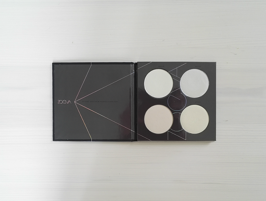 The palette comes with four highlighters with a kind of a metallic/pearlescent finish in pastel green, violet, pink and yellow. They are definitely the kind of mermaid or unicorn colors that have been trending recently. Not going to lie, I think the powders look pretty odd in the pan: they seem kind of chalky and washed out in pictures. When applied, however, they are absolutely lovely! The formula has a velvety texture and it feels pretty buildable. The highlighters are a bit powdery and kick up a little when I pick them up with a brush, but they apply and blend out well. I'm not sure if you can achieve a blinding tin man -level highlight with these, but you can definitely create a beautiful glow-from-within look.